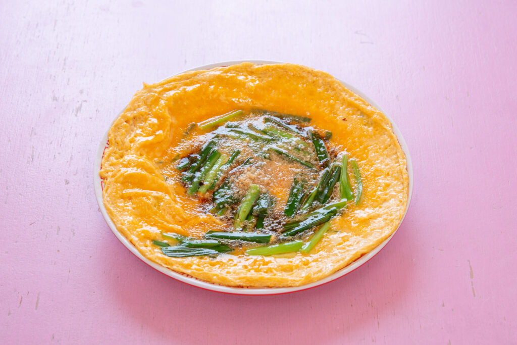 2025.10.11 お料理紹介vol.2 博多風ニラ玉 厳選した卵と牛乳、秘伝の醤油で作るシンプルなニラ玉。1番の特徴は円形状!これが博多風!まんまる食堂では、とろっとろの半熟に仕上げております。オープン当初からの人気商品で、当店オリジナルの「魚介な辣油」にも合いますよ〜是非お試しください!