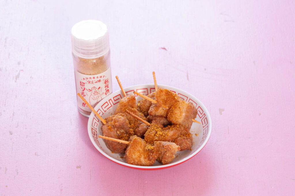 2025.10.15 お料理紹介vol.4 豚のクミン揚げ 食べやすいサイズにカットした豚バラ肉をクミン等のスパイスで下味をつけ、これまた食べやすいように爪楊枝に刺して唐揚げにしました。伝説の超ソルトシリーズのクミン塩をかけてお召し上がりください。見た目は地味ですが、リピートの多いお料理です。是非、お試しください。