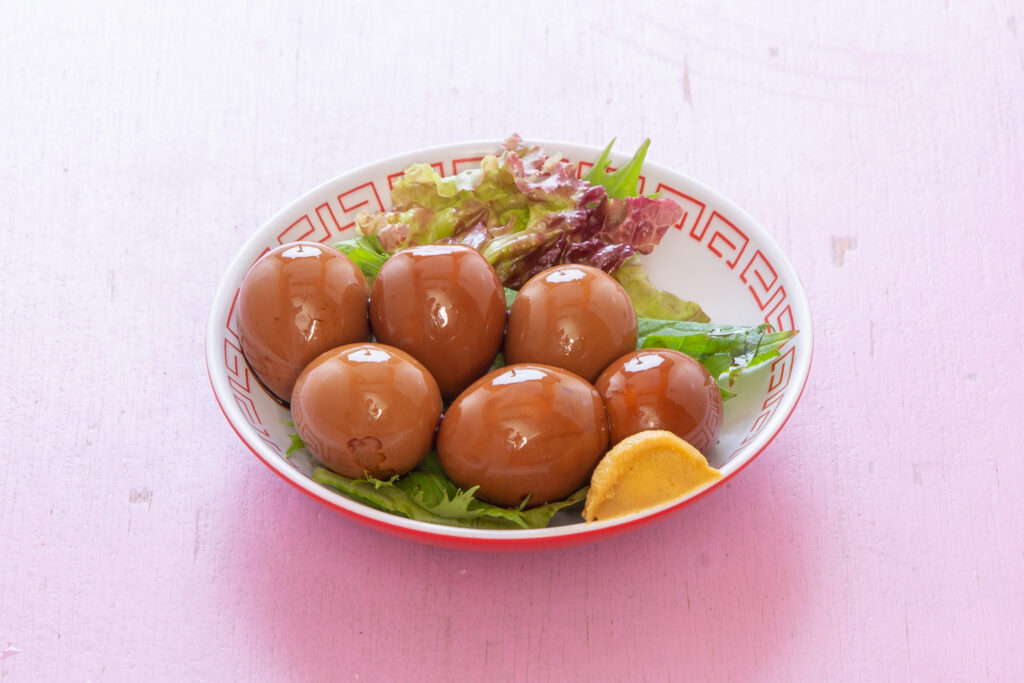 2025.10.16 お料理紹介vol.5 うずらの味玉 まんまる食堂のうずらの味玉を作るには、まず、豚の角煮を3時間炊くところから始まります。豚の角煮は中国醤油をベースにした特製のタレに漬け込み、豚肉のエキスが滲み出たそのタレにうずら卵をドボン!!まっ茶色な味の染みたうずらの味玉の完成です☆カラシをつけてお召し上がりくださいね〜是非、お試しください!