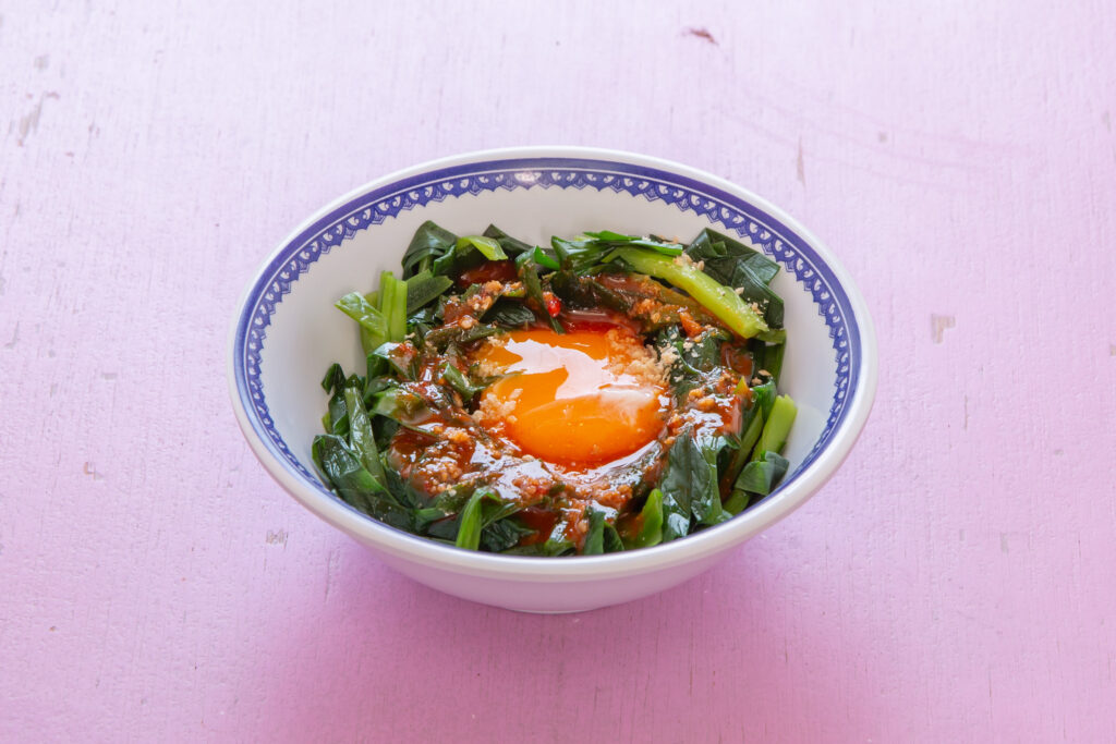 サッとボイルしたニラに卵黄を乗せ、